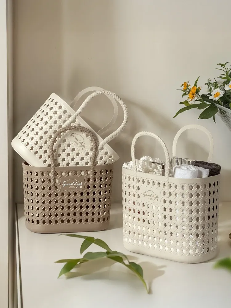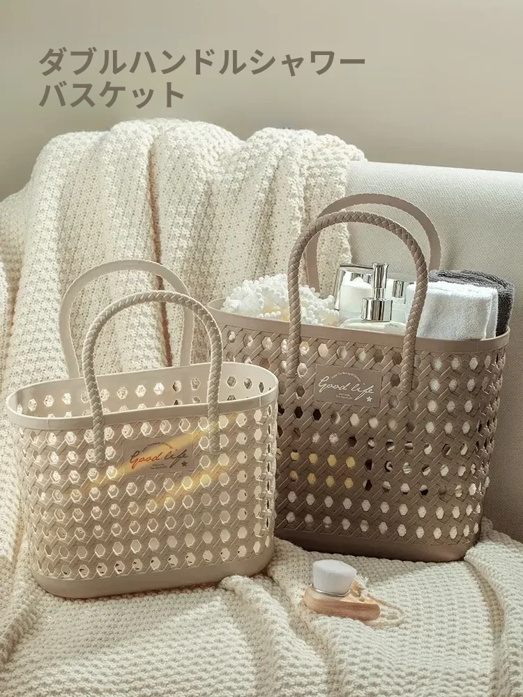 おしゃれな手提げバスケット!バスルームで使える便利な洗面用具収納バスケット。軽量プラスチック製で持ち運び簡単、整理整頓に最適!お風呂タイムをもっと快適にするアイテムです。