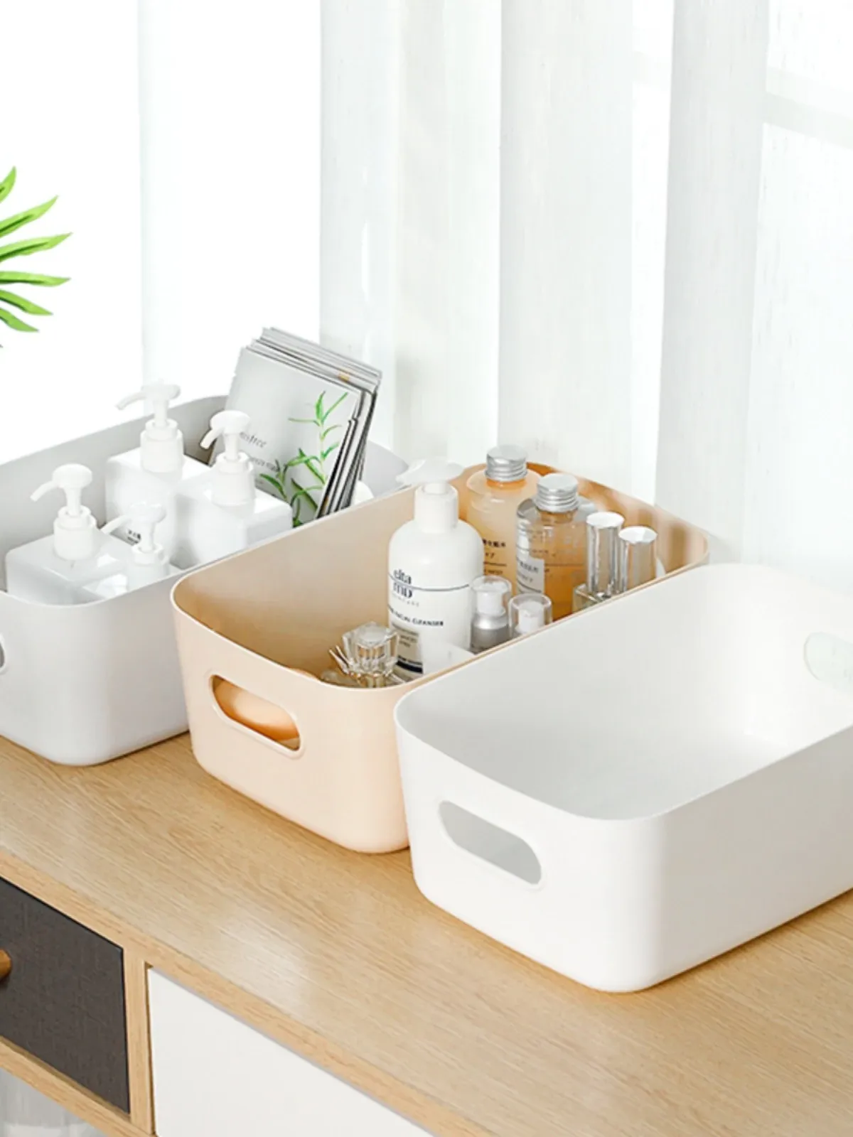 デスク周りをスッキリ整理!シンプルな収納ボックス - 浴室や化粧品、デスク上の小物やお菓子をおしゃれに収納できる便利な収納バスケット。どんな場所にもフィット!