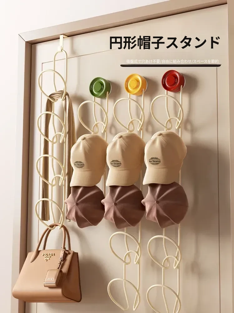 吸盤式ハット収納マジック!穴を開けずにドアの裏に取り付け可能。スカーフやコート、帽子をすっきり収納し、バッグもオシャレにディスプレイ!スぺースを有効活用して、生活空間をおしゃれに演出します!
