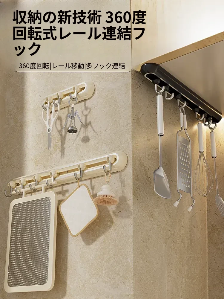 壁掛けフック 一列 取り付け不要 強力耐荷重 万能回転スライドトラック 粘着フック 多機能キッチン収納ラック【スペースを有効活用!】