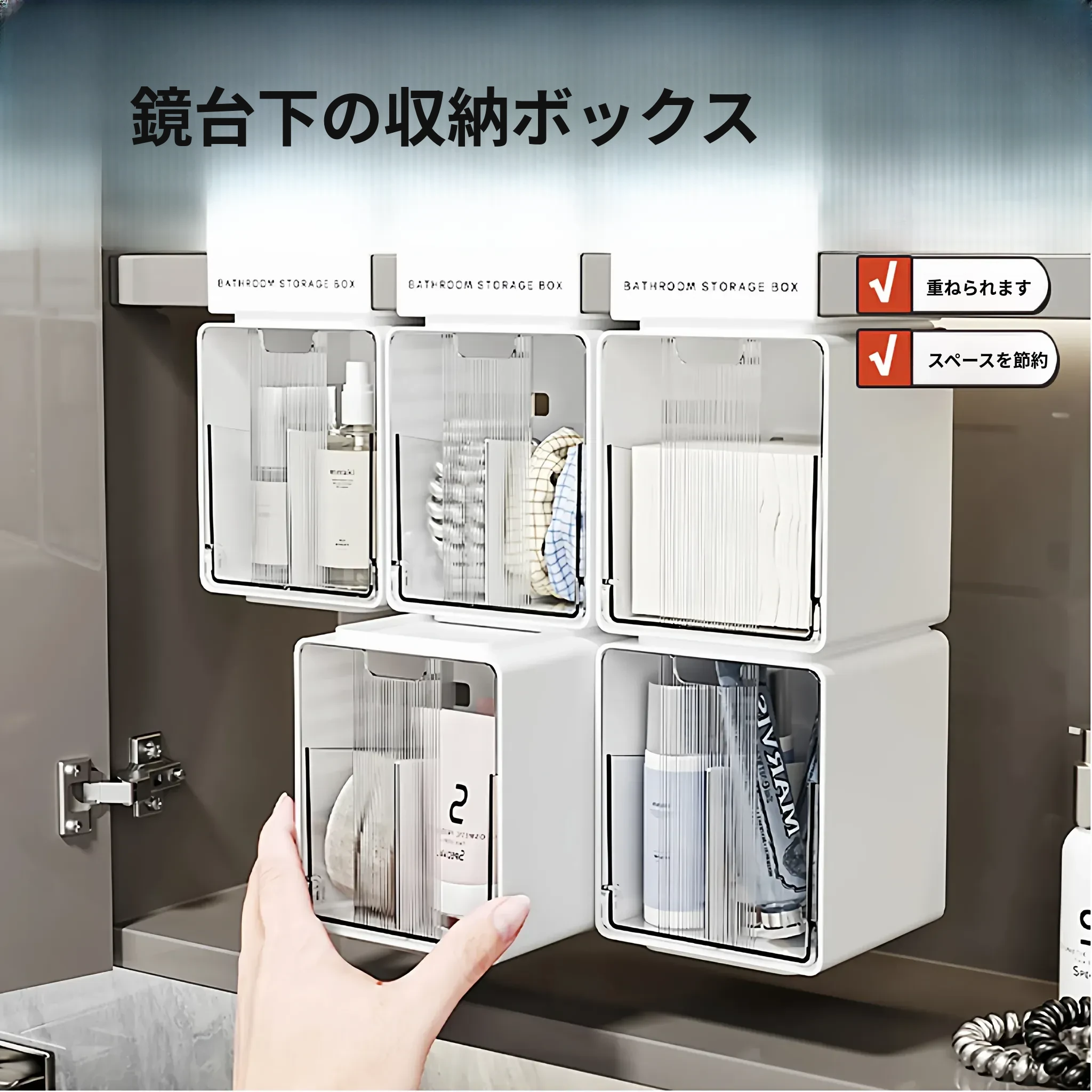 デスク下収納ボックス - 鏡の後ろに置ける便利な収納アイテム!バスルームや洗面台で使える層別仕切り付き、綿棒や化粧用コットンもスッキリ整理!あなたの生活空間をもっとスマートに!