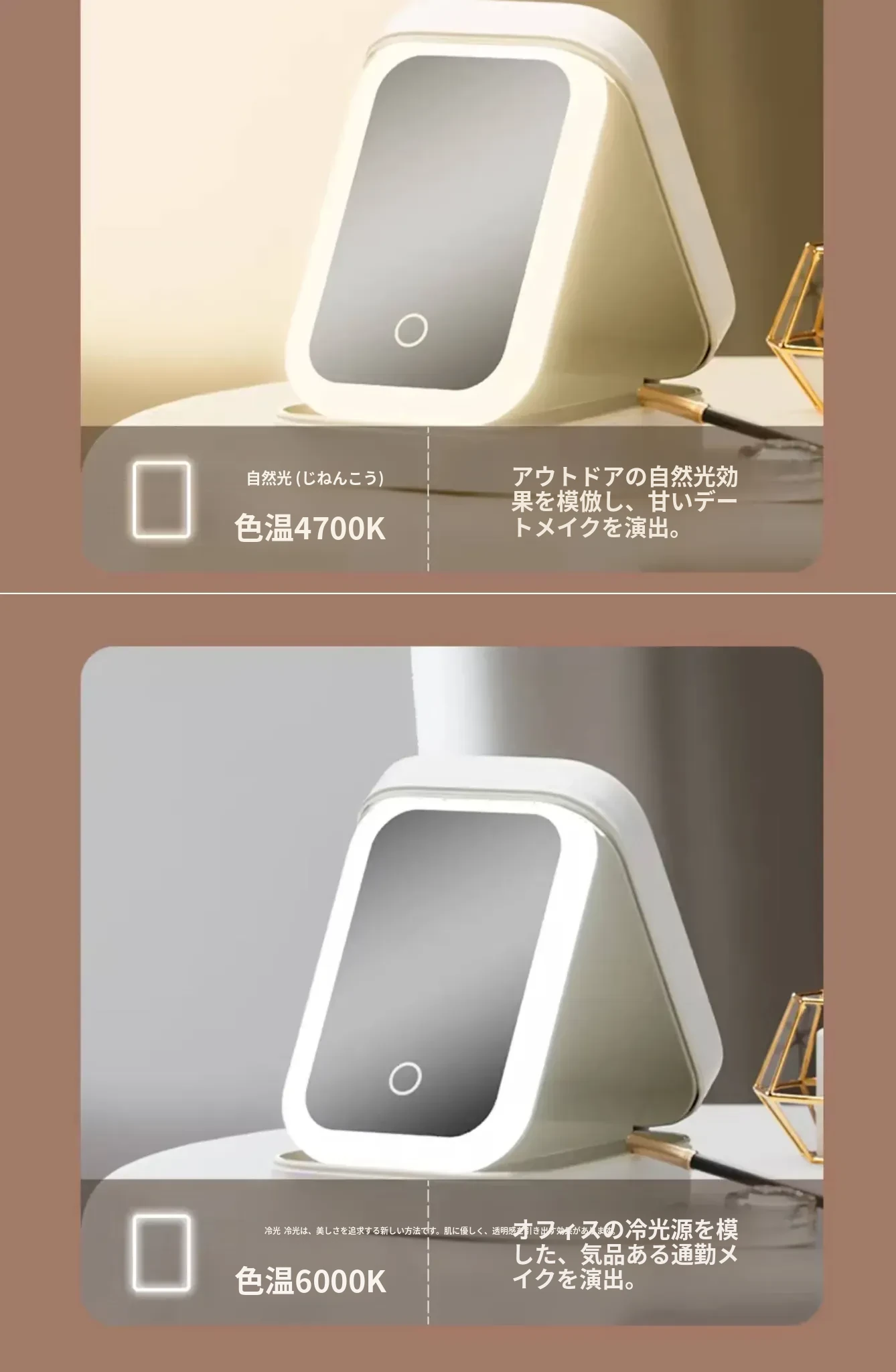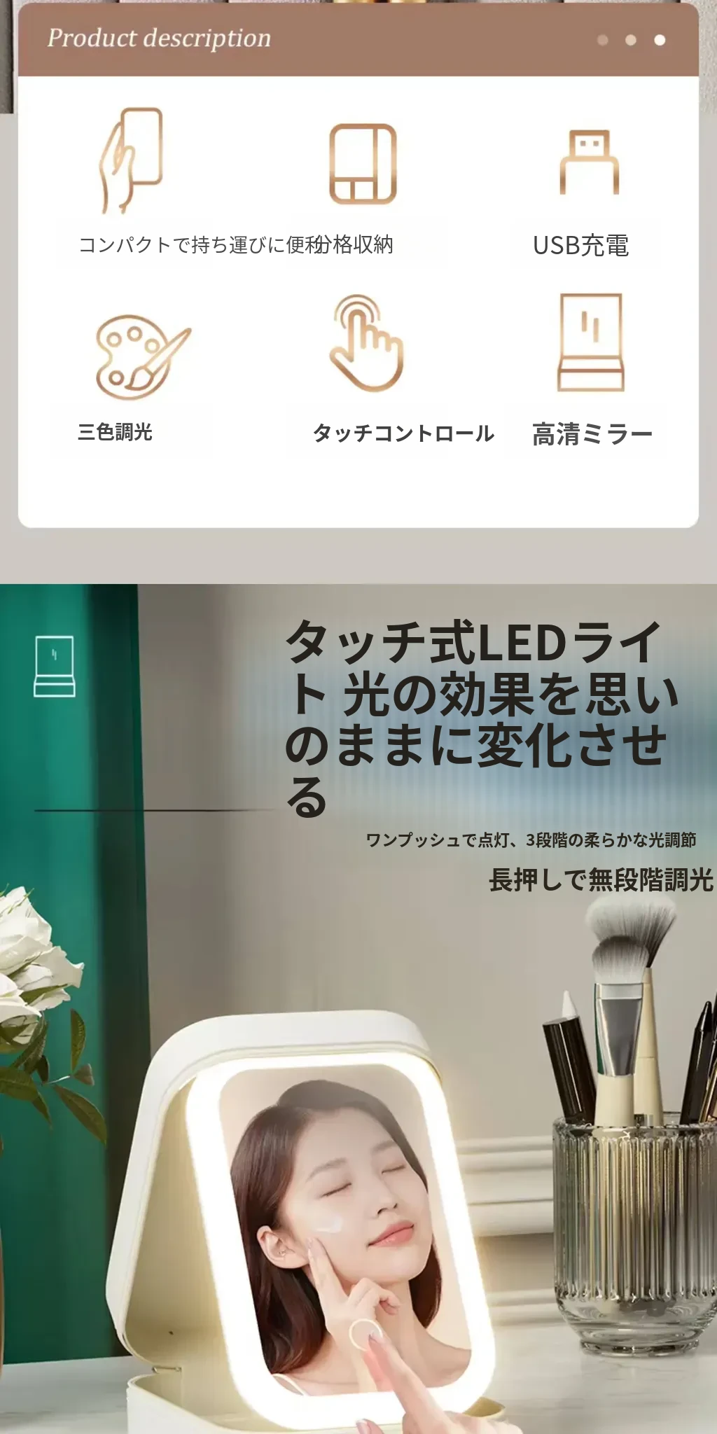 清新グリーン【内蔵ライト付き化粧鏡】三色光源/無段階調光