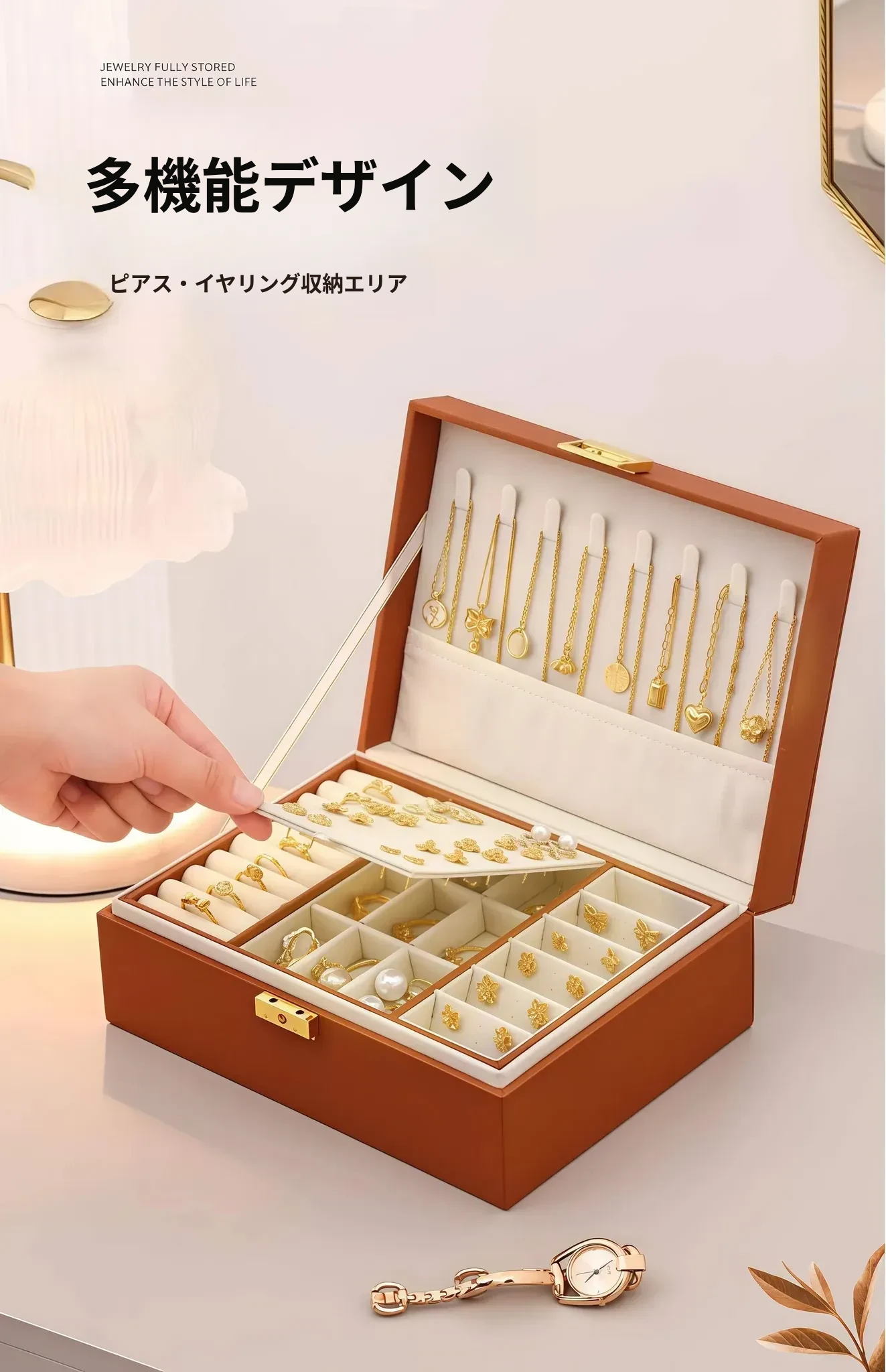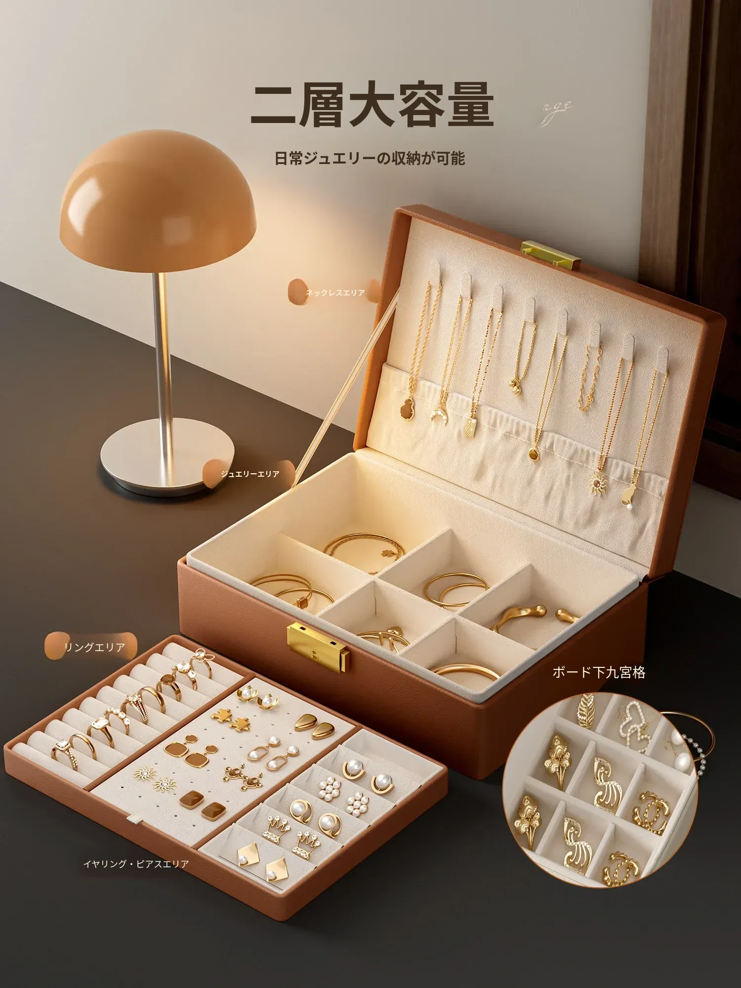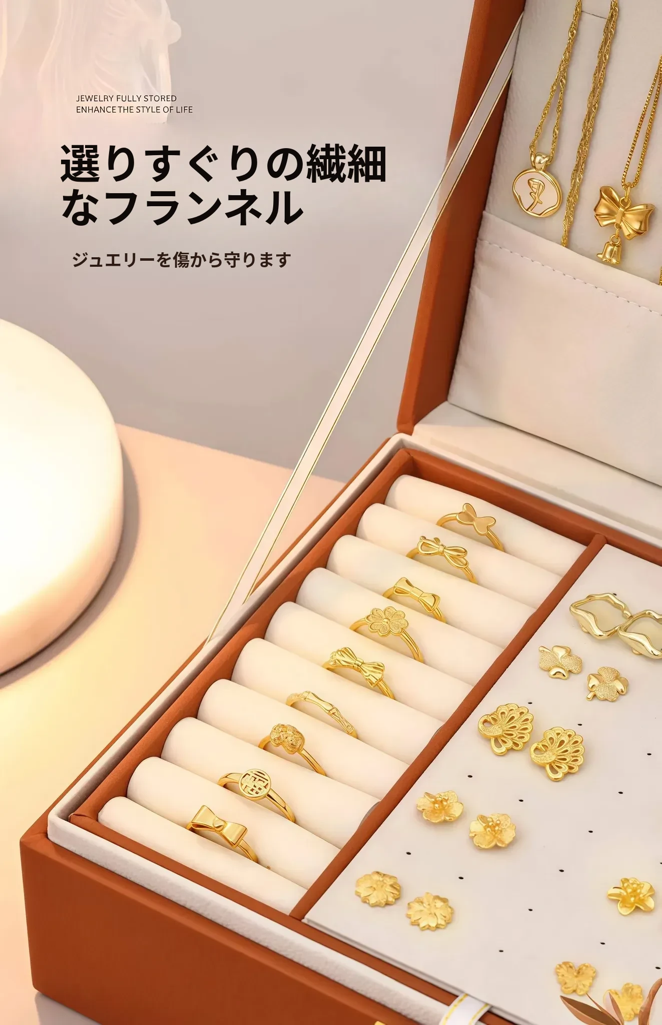 高級感あふれるゴールドジュエリーボックス - 新作!酸化防止機能付き、イヤリング・ネックレス・ピアス・アクセサリーを美しく収納。大切なジュエリーを守る、洗練されたデザインの収納ボックス!