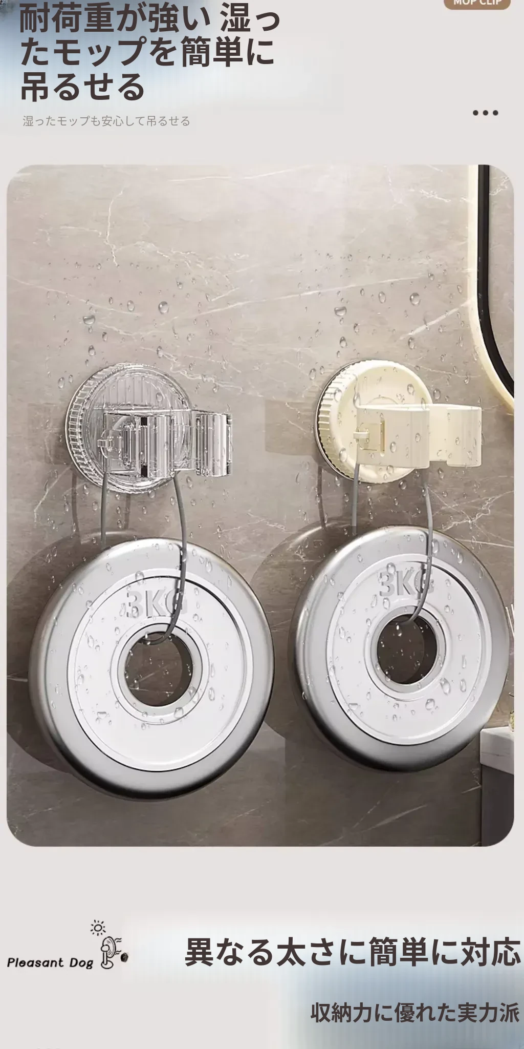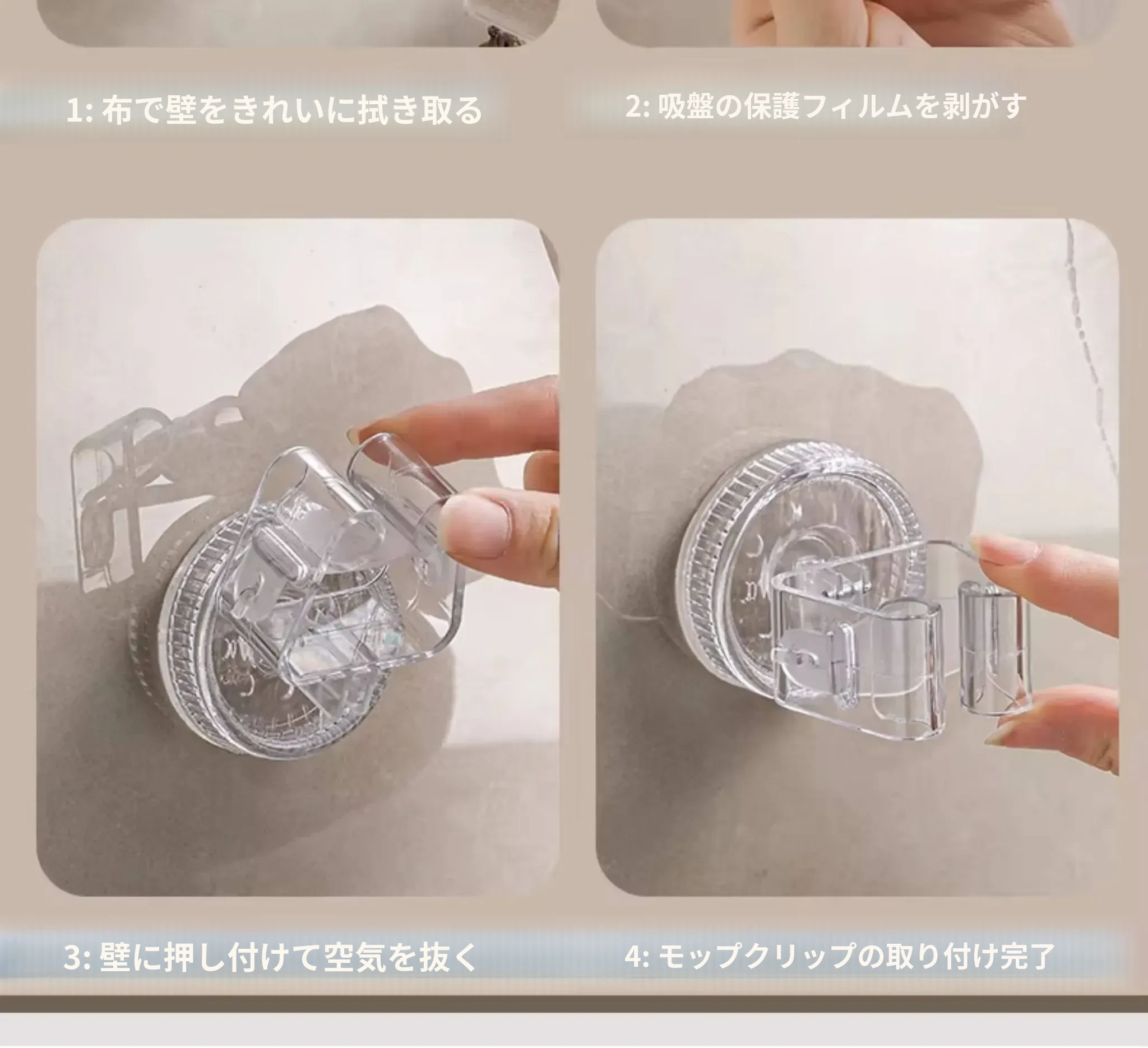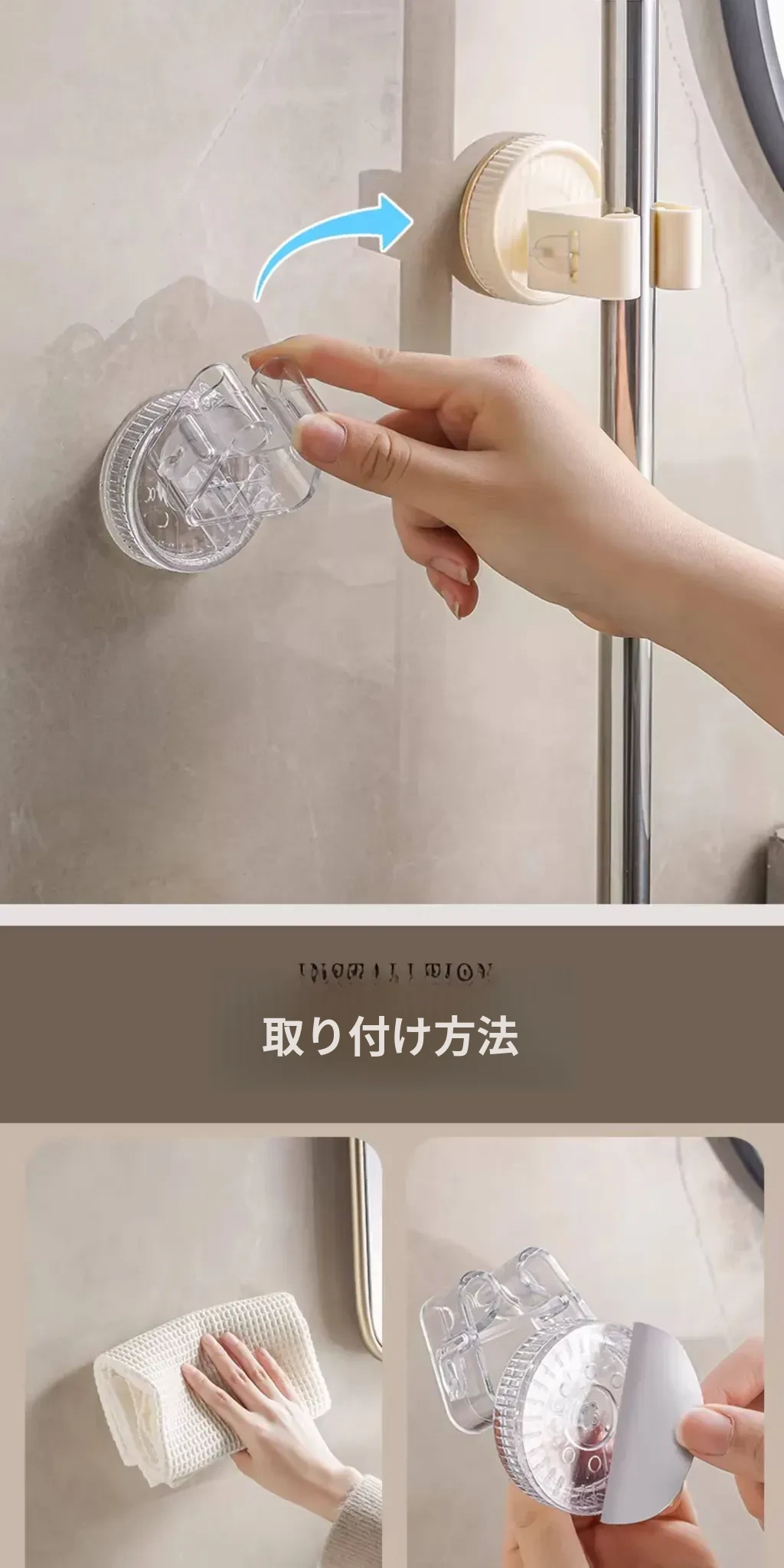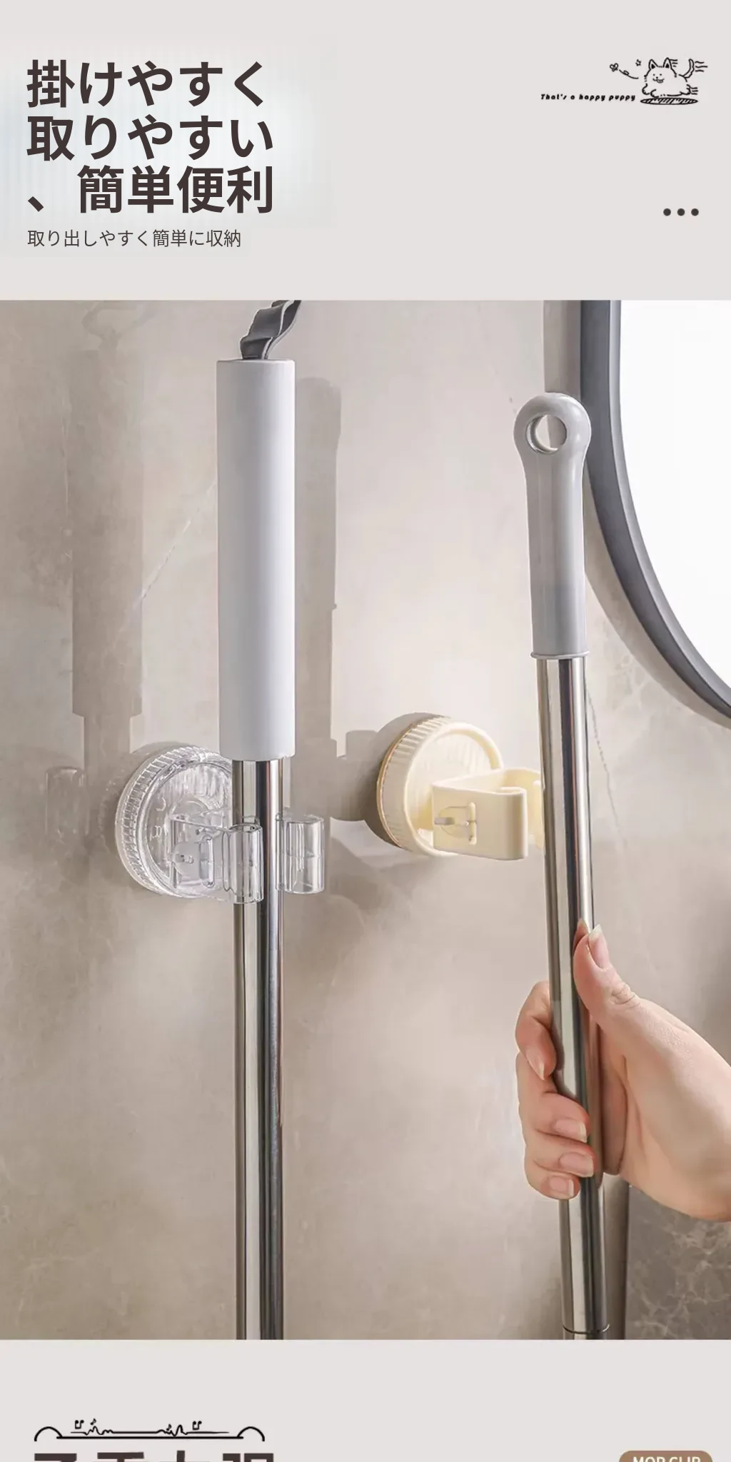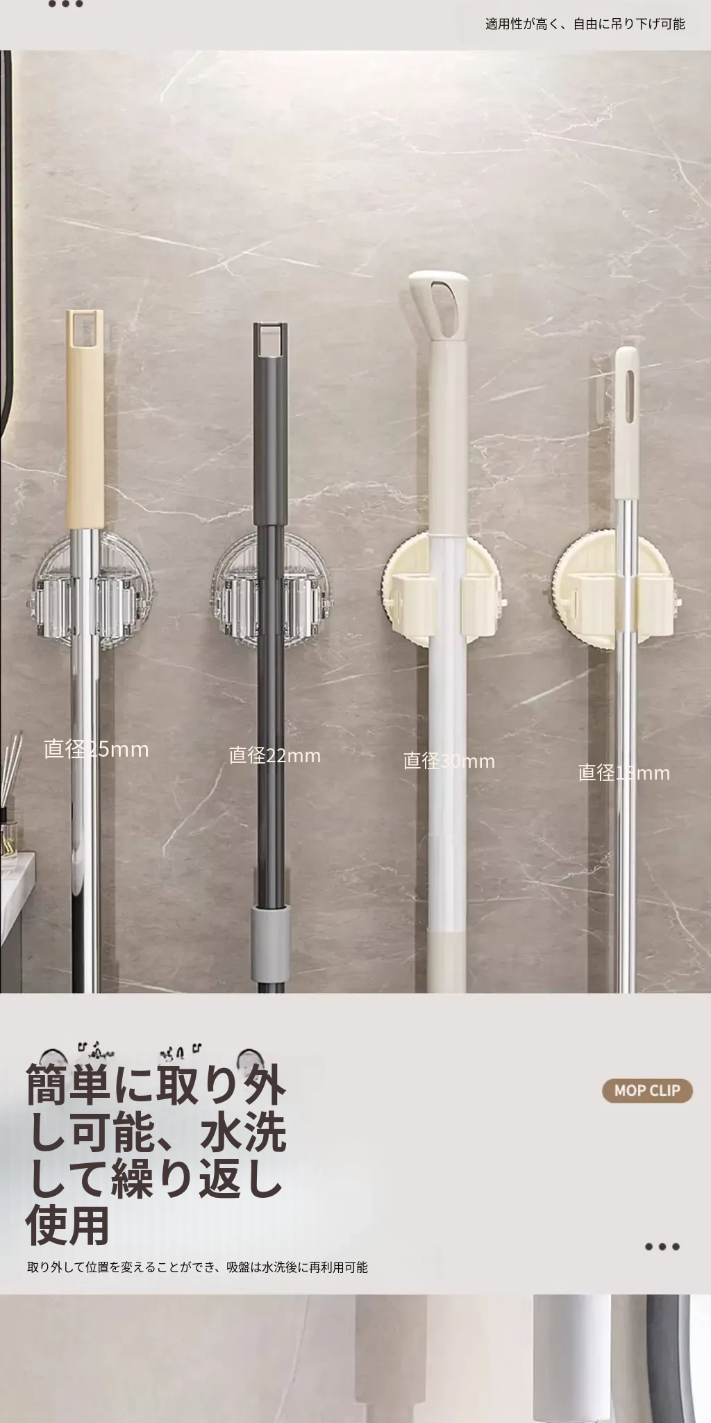 吸盤モップ壁掛けクリップ|トイレ・バスルームに最適!穴を開けずに簡単装着!モップやほうきをしっかり固定できる収納ラックで、スッキリ整理整頓!