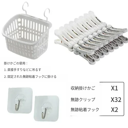 【店長おすすめ】衣類クリップ32個+ハンギングバスケット1個+無痕粘着フック2個