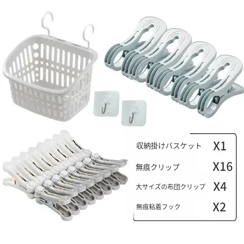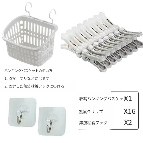 衣類クリップ16個+ハンギングバスケット1個+無痕粘着フック2個
