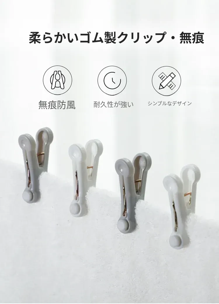風に強い無痕干しクリップ!衣類や布団をしっかり固定するプラスチックソフトゴムクリップ。洗濯物を安心して干せる便利なアイテムです!